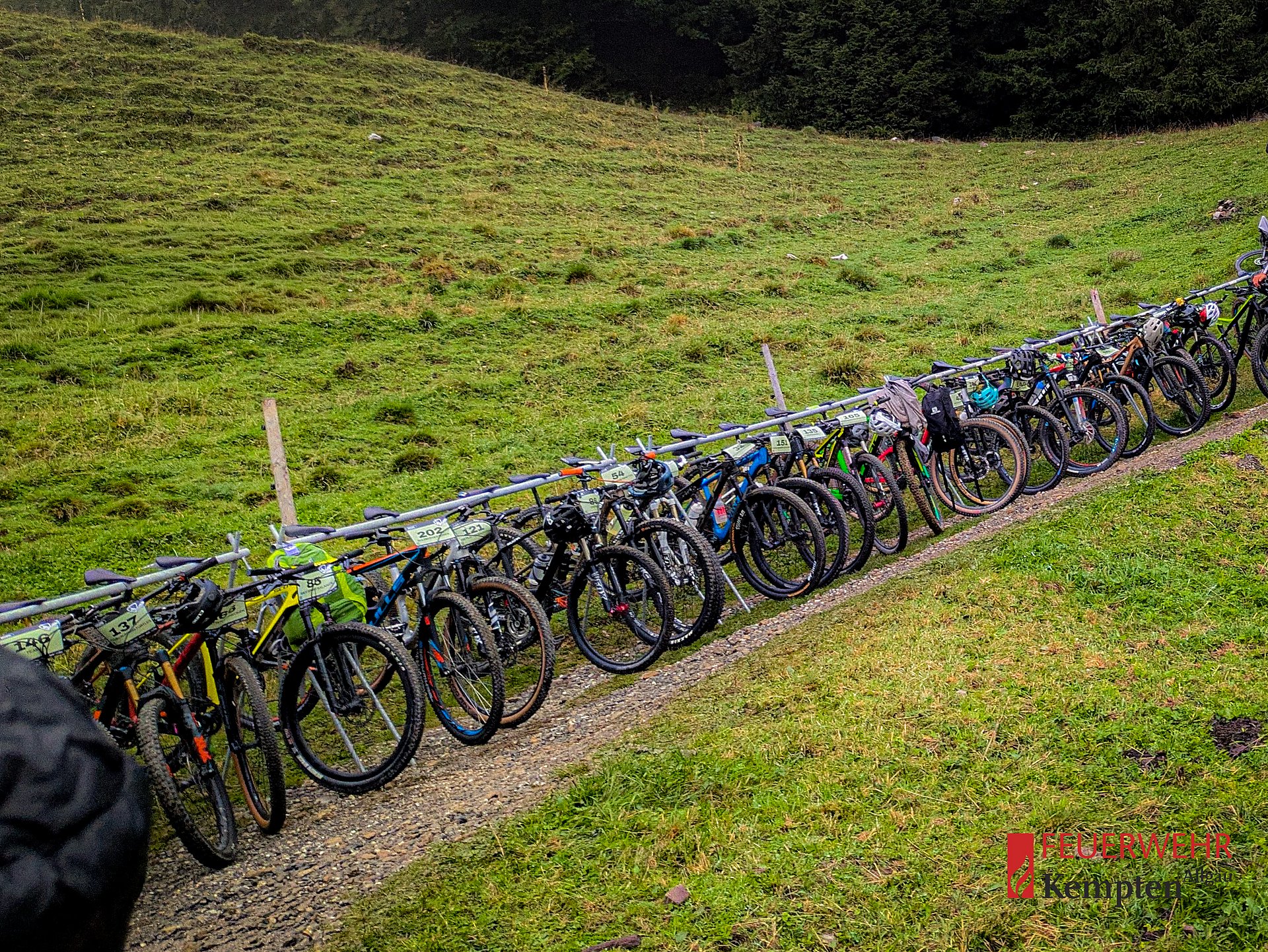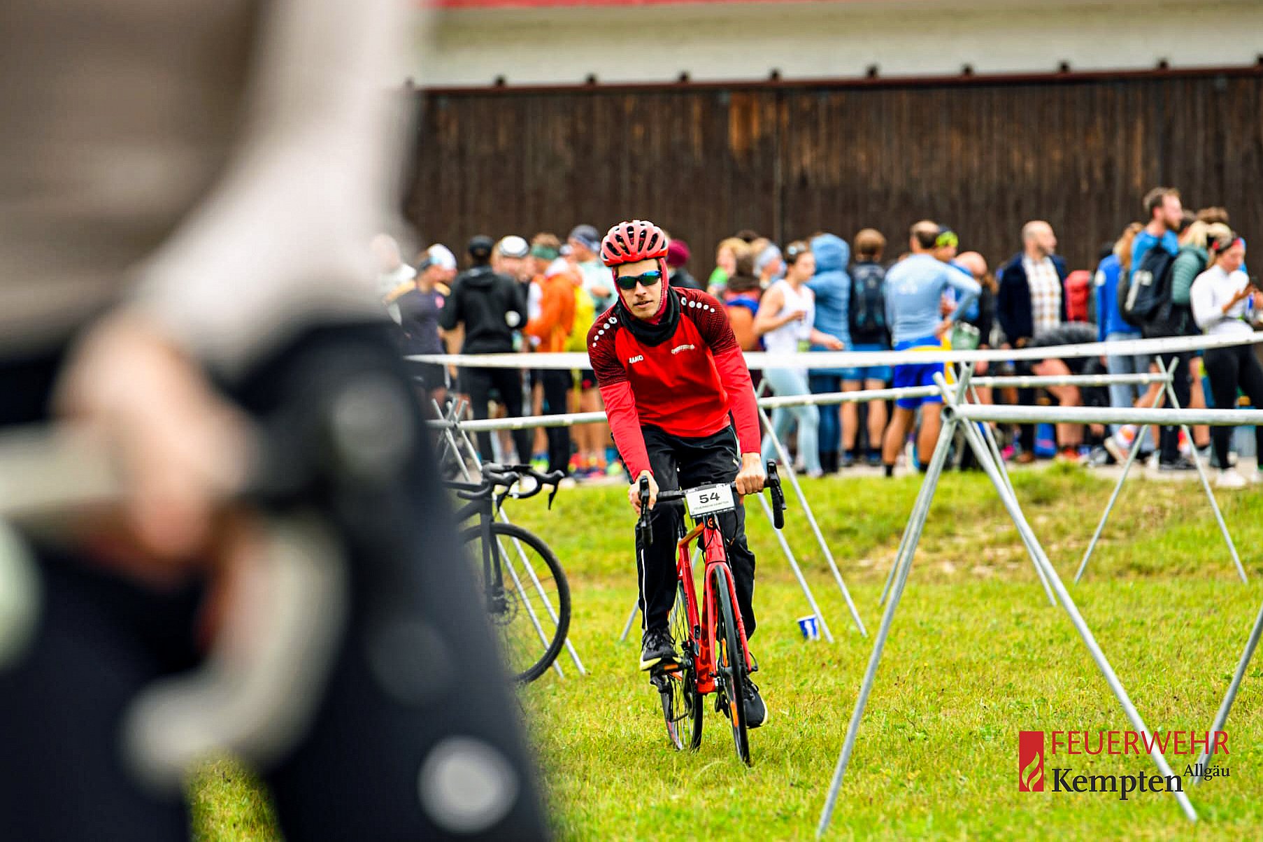 Dem Equipment zufolge waren die Starter der Rennradetappe allesamt Vollprofis. Das nahm Philipp den Druck von den Schultern, der auf dem Rennrad seiner Freundin, in Jogginghose und Turnschuhen startete. Von hinten rollte er das Feld auf und überholte schätzungsweise 15 Kontrahenten. Nach 360Hm und bei einsetzendem Nieselregen erfolgte die Übergabe an den sichtlich überraschten Tom, der hinterm Dixi hervorsprang. Nach dem Berglauf folgte der wagemutige Alpinlauf. Wagemutig wurde hier der Grünten im schnellsten Schritt nach unten bezwungen. Nach der Übergabe zum Mountainbike, mit dem der restliche Berg abgefahren wurde, folgte der Schlusslauf.