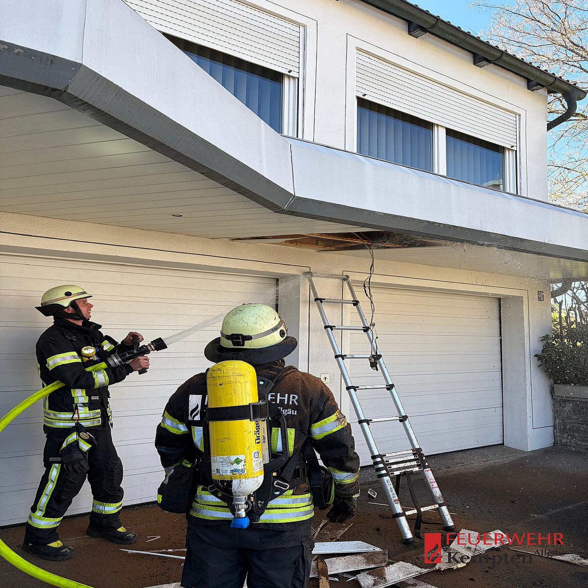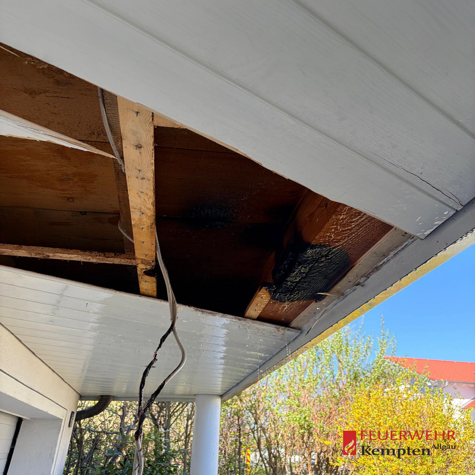 Vor Ort bestätigte sich die Lage: Aus einer Holzverkleidung im Außenbereich trat Rauch aus. Umgehend wurde die Verkleidung geöffnet, um an den betroffenen Bereich zu gelangen.