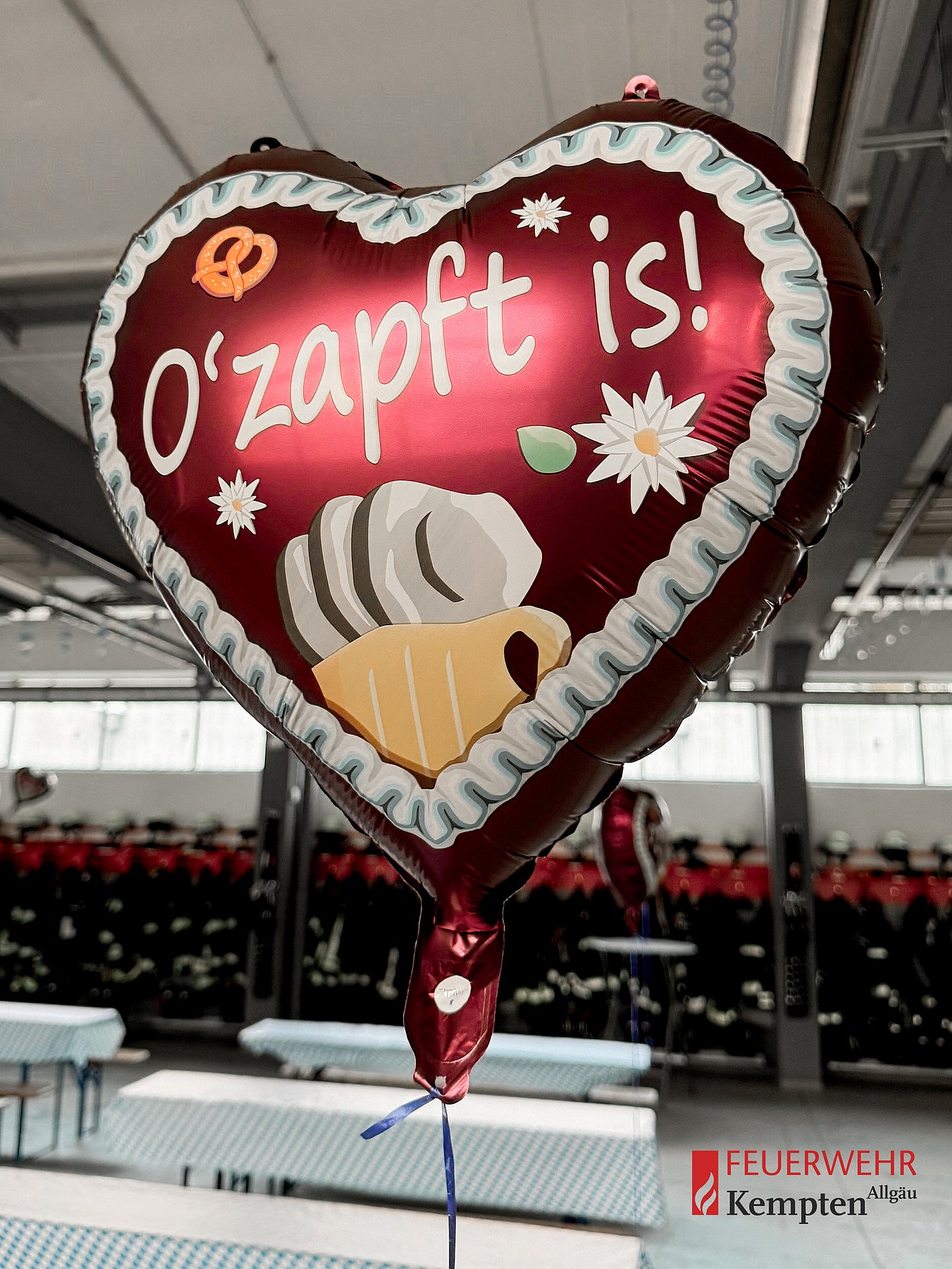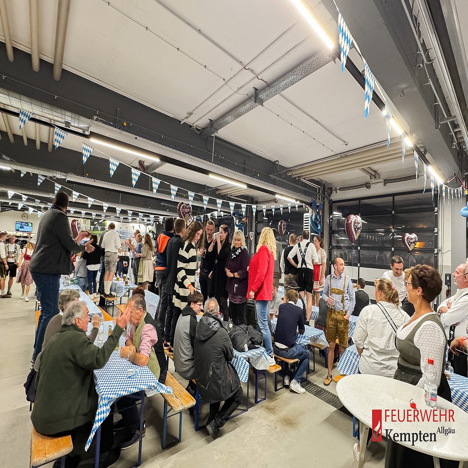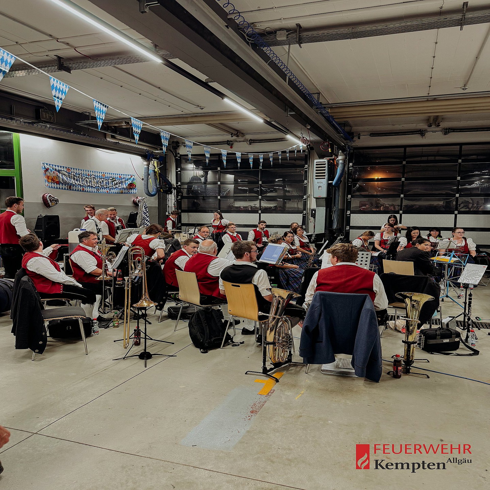 Vergangenen Samstag fand bei der Feuerwehr Kempten auf der Hauptwache ein zünftiges Oktoberfest statt – diesmal in einem ganz besonderen Rahmen: Die Veranstaltung war ausschließlich für unsere aktiven und passiven Mitglieder der Kemptener Wehren zusammen mit ihren Partnerinnen und Partnern bestimmt. In gemütlicher Atmosphäre wurde in der festlich geschmückten Fahrzeughalle gefeiert. Nach dem Anstich des ersten Fasses durch unsere Stadtbrandinspektion kam dank der musikalischen Umrahmung durch den Musikverein St. Mang, bayrischem Buffet und frischem Bier vom Fass schnell beste Stimmung auf. Viele unserer Kameradinnen und Kameraden erschienen stilecht in Lederhose und Dirndl, was dem Abend einen authentischen Wiesn-Flair verlieh.